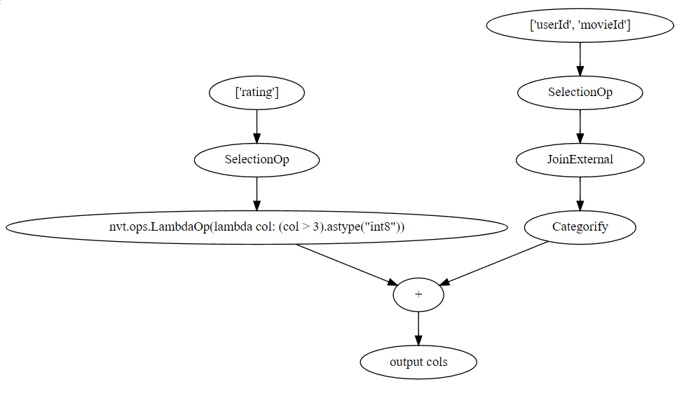 We will first define our workflow. First, we’re going to use implicit ratings where 1 is a rating of 4 and 5. Second, we’ll be converting the genres column into a multi-hot categorical feature. Third, we’ll be joining the ratings and the genres tables. Note that the >> is overloaded and behaves just like a pipe. If you run this cell, a DAG will appear.